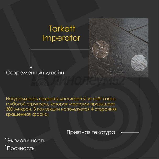 Представляем вам новую коллекцию ламината IMPERATOR. Натуральность покрытия достигается за счёт очень глубокой структуры, которая местами превышает 300 микрон. Мы создаём супер-глубокое тиснение, придающее дизайну особую эстетическую привлекательность и выразительность. Максимальная устойчивость к истиранию АС6 на 42% превышает показатели продуктов с 33-м классом применения. В коллекции IMPERATOR используется 4-сторонняя крашенная фаска. Толщина 8 мм. Ширина планки – наиболее популярная: 194 мм. "TARKETT" всегда предлагает решения для различного рода зданий, помещений и общественных зон. Широкая линейка наших продуктов (ПВХ-покрытия, ламинат и паркет) и большой выбор уникальных дизайнов. "TARKETT" - это лучшее качество...