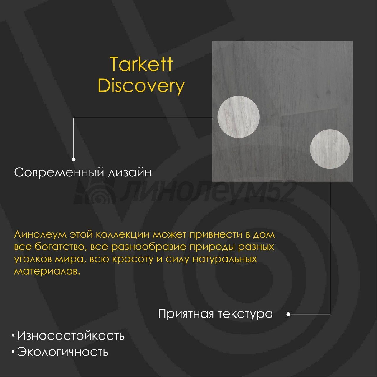 Теперь натуральный мех, классический паркет или грубо обработанная массивная доска могут украсить ваш дом, не нанося ущерба природе - с экологическим линолеумом от коллекции "DISCOVERY" можно привнести в дом все богатство, все разнообразие природы разных уголков мира, всю красоту и силу натуральных материалов. Дайте волю своей фантазии, а качественные и долговечные покрытия коллекции "DISCOVERY" - позволят воплотить ваши мечты в нашей реальности...