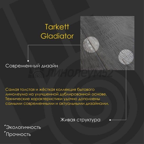 "GLADIATOR" - это самая толстая и жёсткая коллекция бытового линолеума на улучшенной дублированной основе в ассортименте "TARKETT". Широкая линейка продуктов (ПВХ-покрытия, а ещё ламинат и паркет) и большим выбором дизайнов позволят создать индивидуальный стиль для каждого интерьера. "TARKETT" находится в постоянном сотрудничестве с архитекторами, проектировщиками и дизайнерами, а также управляющими компаниями, стремясь принести комфорт в любые помещения...