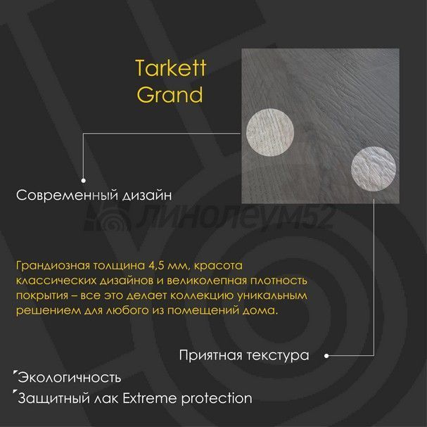 Грандиозная толщина 4,5 мм, красота классических дизайнов и великолепная плотность покрытия - всё это делает коллекцию "GRAND" уникальным решением для любого помещения в доме. Запатентованная технология создания рельефа "ЖИВАЯ СТРУКТУРА" реалистично воссоздает текстуру и удивительно точно передает ощущения прикосновения к натуральным материалам, воплощенным в наших дизайнах. "GRAND" - передовые технологии и высокие моральные ценности по доступной цене...