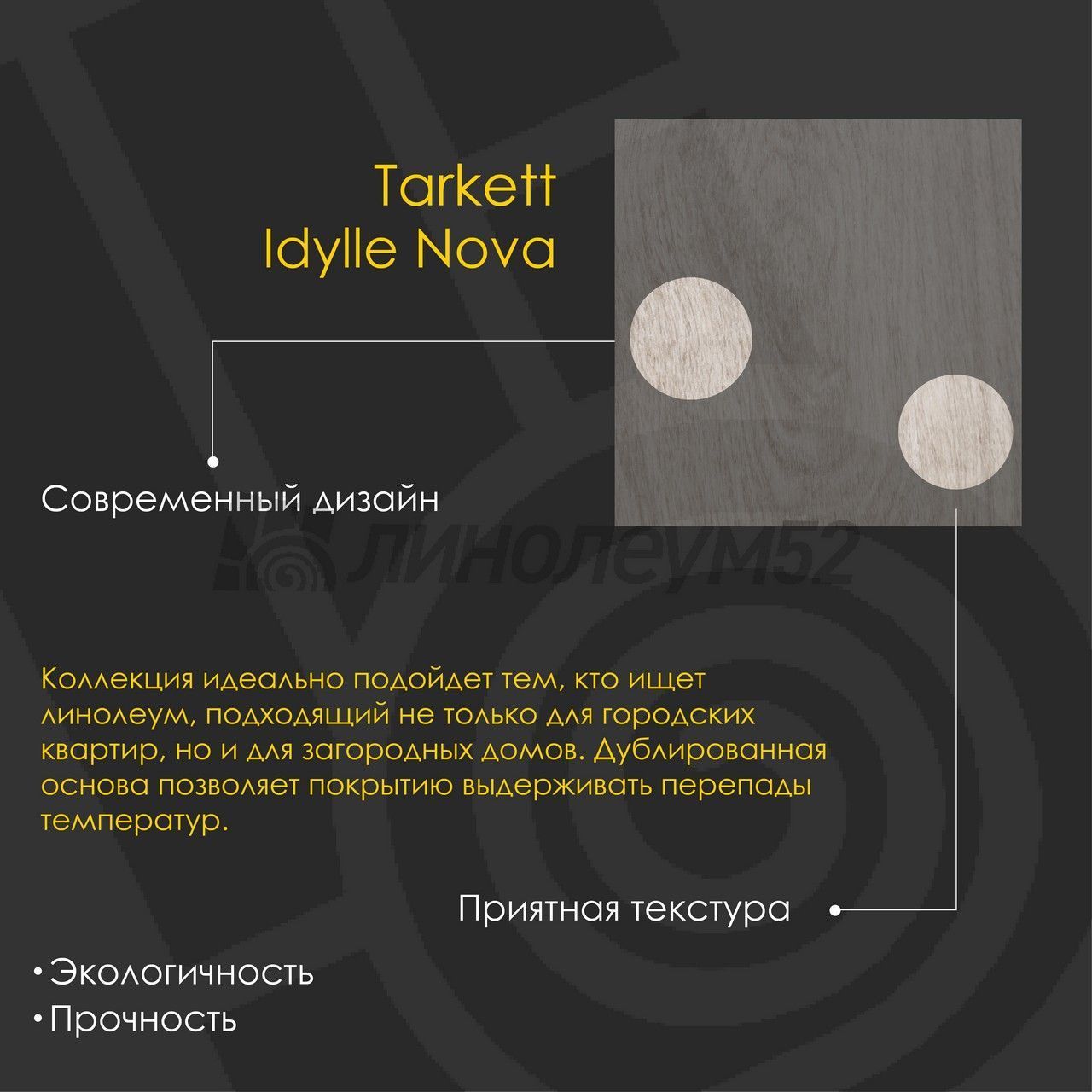 Уникальные свойства: Высокая износоустойчивость покрытия / Дизайн представлен в разных ширинах / Подходит для пола с подогревом +27°С / Уникальный стиль / Экологичность / Экономичный выбор для покупателей