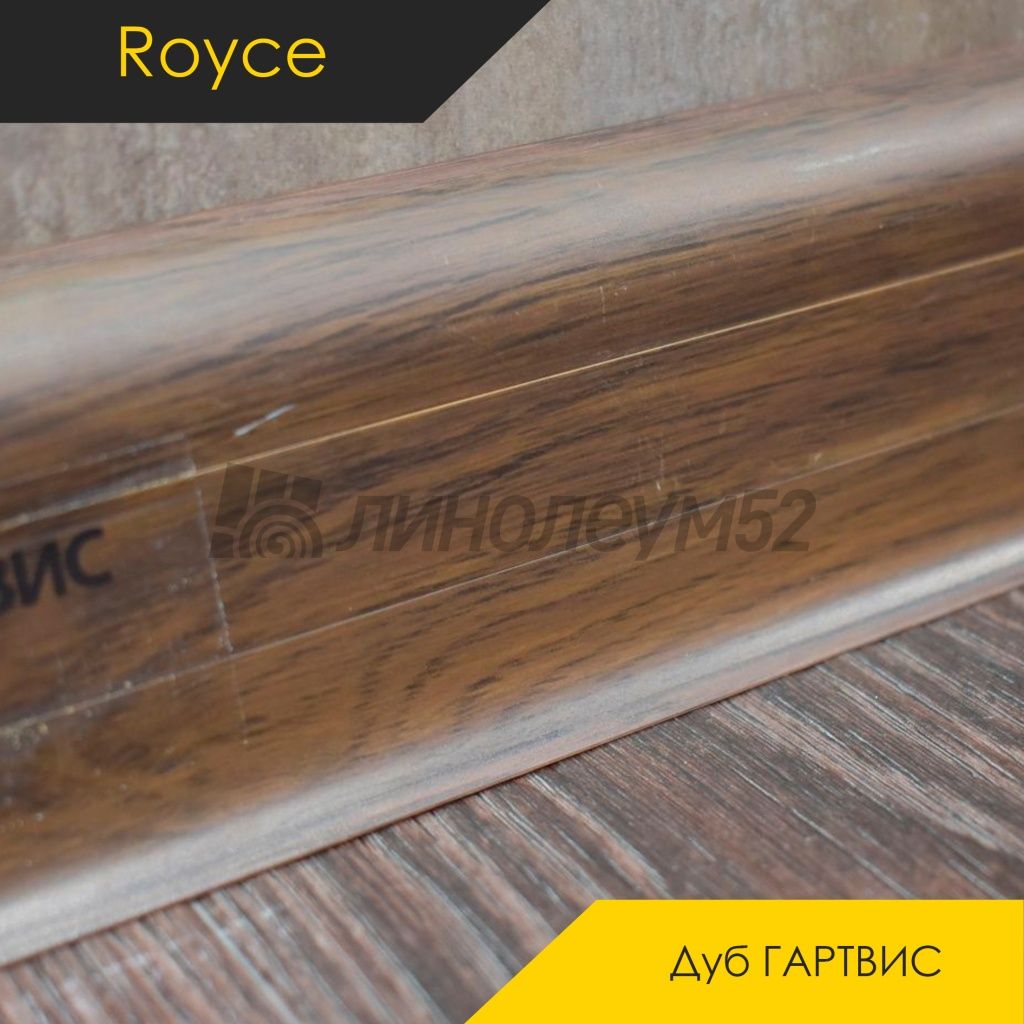 Напольный плинтус - АКСЕССУАРЫ Плинтус ROYCE 58 - Дуб ГАРТВИС 818 / ПВХ от Royce Коллекция:: Classic - Royce, Торговая марка:: Royce, Тип товара:: Плинтус - Напольный, Применение на покрытие:: Универсальное, Морозостойкость:: Отсутствует, Ширина:: 0.022, Длина:: 2.200, Цветовая гамма:: Коричневый, Вид имитируемой древесины:: Дуб - ТЁМНЫЙ, Допустимые зоны применения:: Жилые помещения / Кабинеты, Дополнительные товары: Наружный угол под плинтус - ROYCE CLASSIC 58 / ФУРНИТУРА / Внутренний угол под плинтус - ROYCE CLASSIC 58 / ФУРНИТУРА / Соединение под плинтус - ROYCE CLASSIC 58 / ФУРНИТУРА / Заглушки (пара) под плинтус - ROYCE CLASSIC 58 / ФУРНИТУРА, Страна производитель:: Россия, Класс пожарной опасности:: КМ5, Срок службы:: 20 лет, Высота:: 0.058, Кабель-канал:: Да, Уплотнитель по краю:: Да, Материал:: ПВХ, Уникальные свойства:: Крепёж в комплекте не идёт / Маскирует неровности по стенам / Простота монтажных работ / Уникальный стиль / Экономичный выбор для покупателей,