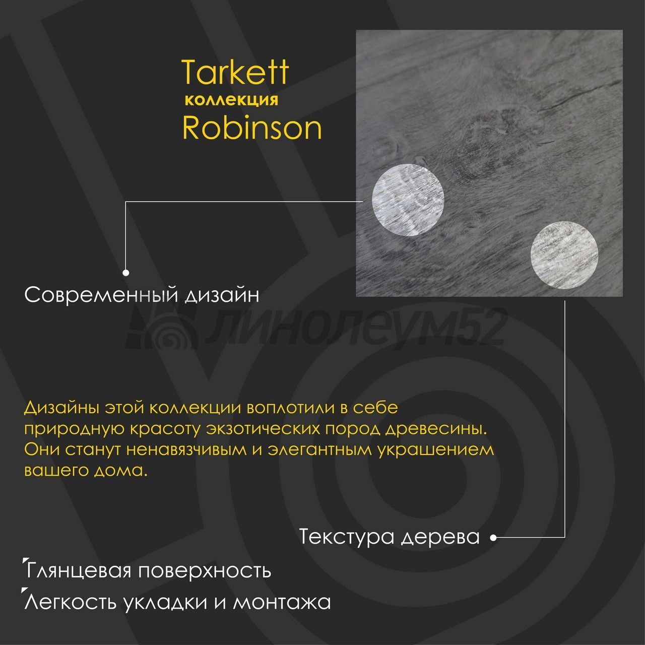 Экзотические мотивы - актуальный тренд. Дизайны коллекции "ROBINSON 8/33" воплотили в себе природную красоту экзотических пород древесины, они станут ненавязчивым и элегантным украшением вашего дома, изюминкой интерьера. Каждый дизайн коллекции уникален, но в то же время неразрывно связан с оригиналом, созданным самой природой. Каждый дизайн совместил в себе современные идеи и вековые традиции. Дух странствий и путешествий в дизайнах коллекции "ROBINSON 8/33". Компания "TARKETT" находится в постоянном сотрудничестве с архитекторами, проектировщиками, дизайнерами и управляющими компаниями, стремясь сделать жизнь людей комфортнее. Имея огромный выбор напольных покрытий, бренд "TARKETT" предлагает решения для различного рода зданий, помещений и общественных зон. "TARKETT" - это ваш совершенный ламинат...