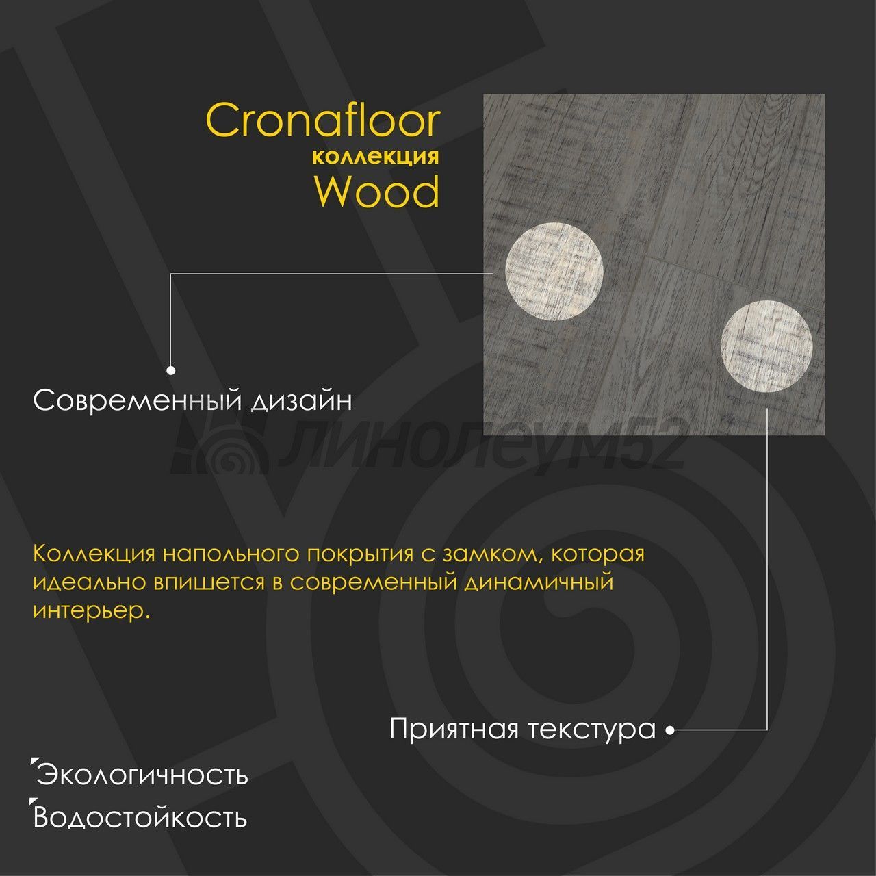 Водостойкий виниловый ламинат на минерально-полимерной основе "SPC" от бренда "CRONAFLOOR" ворвался в нашу жизнь. Классический стиль доски в сочетании с новейшими характеристиками не оставят без внимания наших покупателей. Топовые линейки из серии "WOOD" и "NANO" можно изучить на сайте "ЛИНОЛЕУМ52" или в одном из наших магазинов. Также обращаем ваше внимание, что данное покрытие обладает акустическим комфортом, а также на 100% влагостойкостью. Простота укладки и уборки, также не на последнем месте в списке преимуществ у данного покрытия. Если же у вас ещё остались вопросы, то наши специалисты с лёгкостью помогут найти ответы на каждый из них...