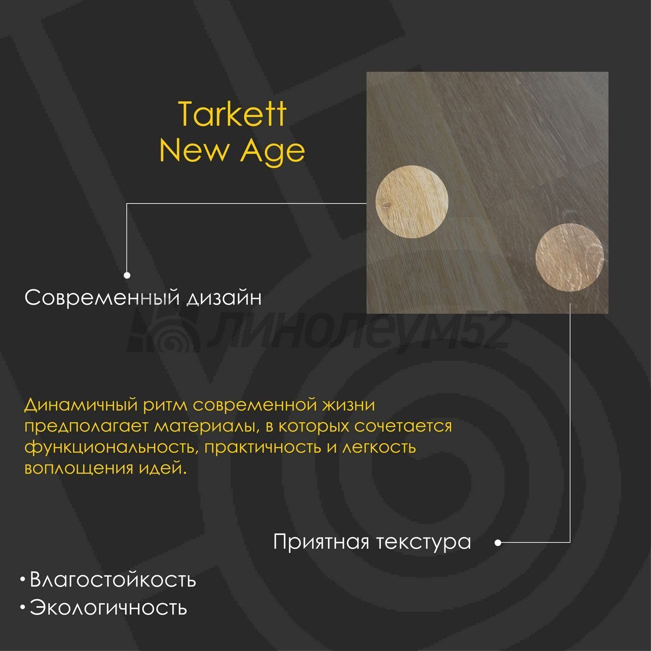 Уникальные свойства: Подходит для пола с подогревом +27°С / Продажа товара отпускается в упаковках / Уникальный стиль / Экологичность / Экономичный выбор для покупателей